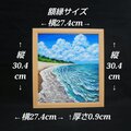 この油絵のサイズは横242mm × 縦272mmで、ナチュラルな額縁に収められています。額縁サイズは横27.4cm × 縦30.4cm × 厚さ0.9cmで、シンプルながらも品のあるデザインが、お客様のインテリアに優雅さをプラスします。壁掛け用の金具も付属していますので、お好きな場所に手軽に飾れ、夏の雰囲気をいつでも楽しむことができます。「真夏の海と砂浜」は、大切な方への誕生日や記念日の贈り物としても自信を持っておすすめ致します。