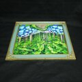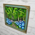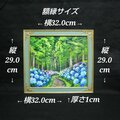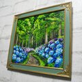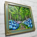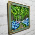 この油絵のサイズは横272mm × 縦242mmで、グリーンパティナ色とライトゴールド色のエレガントな額縁に収められています(額縁サイズ:横32.0cm × 縦29.0cm × 厚さ1cm)。壁掛け用の金具も付属していますので、気軽にお好きな場所に飾ることができます。「梅雨の紫陽花の道」は、大切な方への贈り物や特別な瞬間を彩るアートとして自信を持ってお勧めいたします。