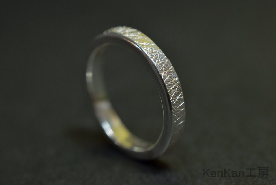 直線状の槌目を全周に、方向を変えながら打ち込んだシルバーリングです。