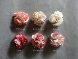 赤からモーブ色、ベージュ色やホワイトのカラーグラデーションの6色展開です。ブローチピンだけではなくヘアピンがついているので、髪飾りとしても使いやすい。ストール留めとしても。