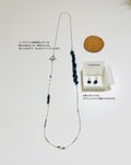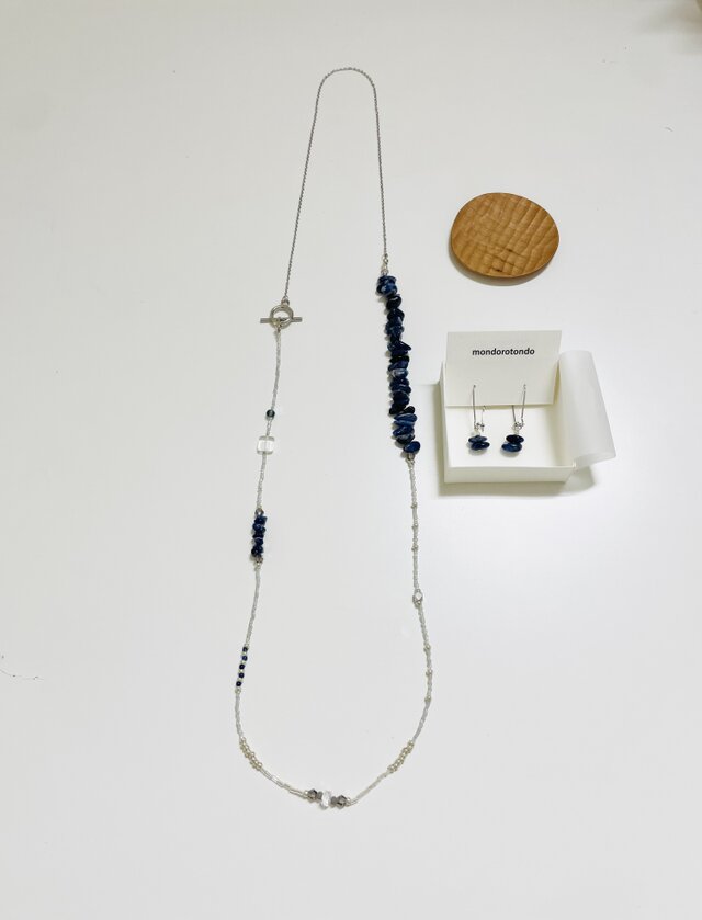 優しいカラーのガラスビーズとソーダライトの神秘的なブルーで、大人な雰囲気のロングネックレスです。