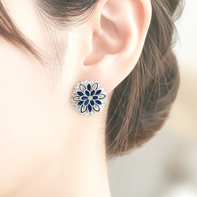 イヤリング 「 白と紺の菊/ダリア 」 軽い つまみ細工 着物 和装 白色 紺色 ネイビー 浴衣 痛くない