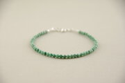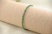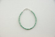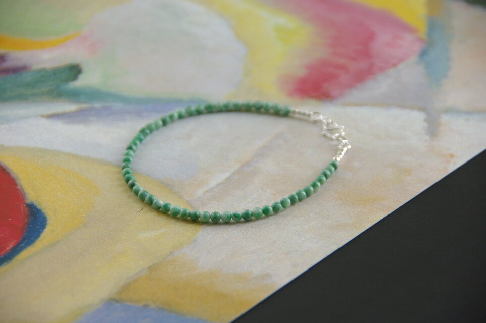 緑と白が混ざり合ったジャスパーのブレスレットです。ジャスパーというと赤色が一般的ですが、こちらは爽やかな緑色をしています。ジャスパーは様々な不純物によって色のついた石英の一種で、ヘマタイトは赤に、リモナイトは茶色や黄色に、クローライト(緑泥石)はグリーンに彩ります。現実的な問題を解決するためのユニークな方法を提案してくれる石です。