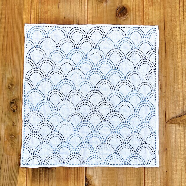 日本の伝統文様「青海波」を一面に刺した、手刺しの花ふきんです。