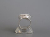 リングのサイズは12号、重さは17g、最大幅は25mm、手のひら側の幅は8mm、金属部分は純銀です。
