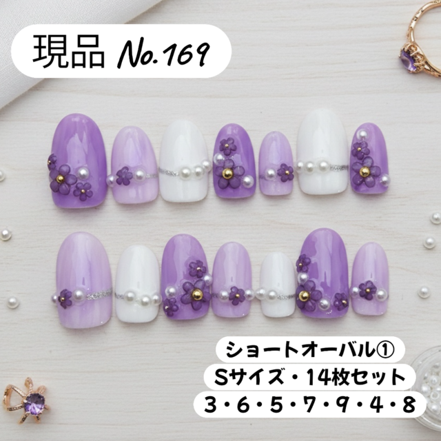 【現品 No.169】ラベンダー×フラワーパールネイル/ショートオーバル①・Sサイズ・14枚セット/上品フラワーネイル
