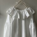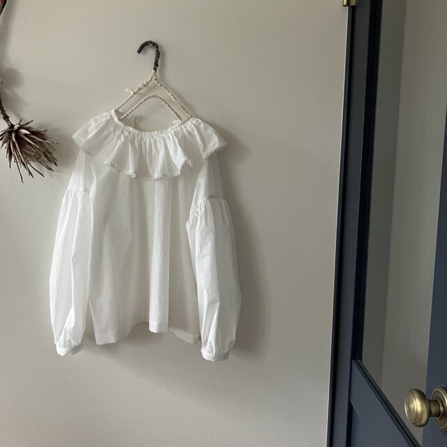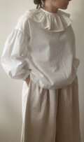 襟元にギューっとギャザーを取り入れたデザイン。ところどころにフリルやギャザーを入れて特別な気持ちでお出かけしたくなる一枚に仕上げました。