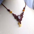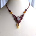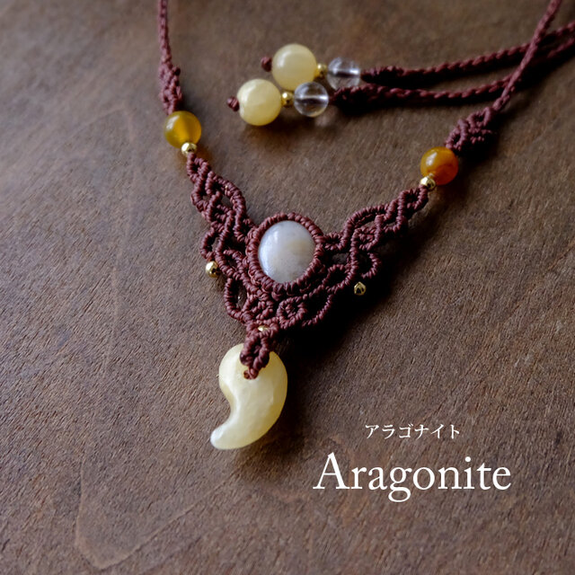 蜂蜜やバター飴のような愛らしいイエローカラーのアラゴナイト勾玉と上部には落ち着いたベージュブラウンのような色合いが魅力のブラジル産アゲート(瑪瑙)を合わせたマクラメ編みチョーカーネックレスです。