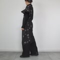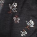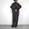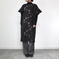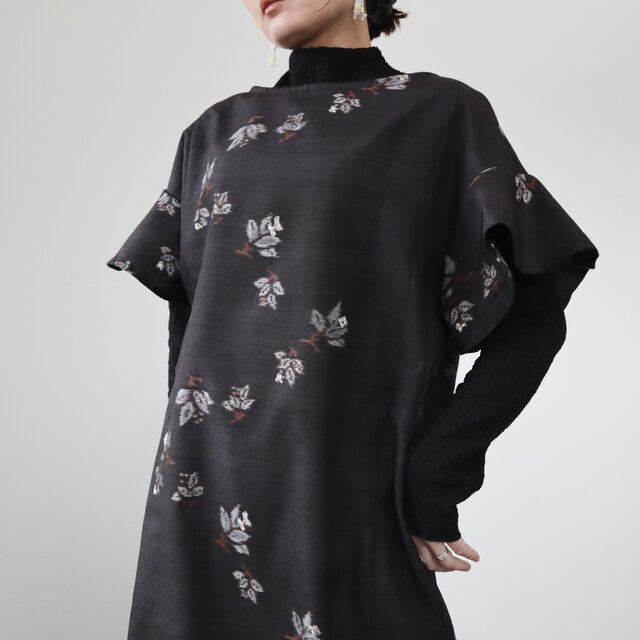 アンティークの紬の着物から作ったフレア袖ワンピースです。黒の地にグレーの植物模様。首周りはボートネックのラインです。重ね着で今の季節から春までご着用になれます。裏地はありません。