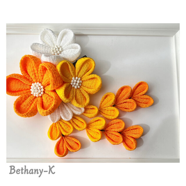 七五三・卒業式に◆大きくて可愛いつまみ細工の髪飾り(下がり付き)◆白×山吹×金木犀色の自分でもママでも簡単につけられるつまみ細工