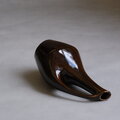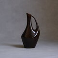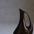 1950~1960年代のドイツで作られたヴィンテージの陶器花瓶。深みのあるチョコレートブラウンの釉薬と、滑らかに立ち上がる有機的なフォルムが印象的な一点です。一体成形で作られたハンドル付きのデザインは、実用性と造形美を兼ね備え、20世紀中頃のドイツ陶器らしいミッドセンチュリーの空気を感じさせます。艶やかな釉薬の表情は光の当たり方によって微妙に変化し、シンプルでありながらも空間に静かな存在感をもたらします。