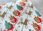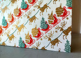 薄手ですが、ハリのある紙質です。ホワイトのベースカラーに、赤い雪そり、金色のトナカイやオーナメント、緑色のクリスマスツリーが描かれています。クリスマスのキラキラした雰囲気がつたわってくる、とても美しい一枚です。