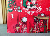 かなり薄手で、パラフフィン紙のような繊細な紙質です。ピンクがかった赤色のベースカラーに、プレゼントをたくさん持ったサンタクロースや、暖炉に靴下を飾るおさない姉弟、クリスマスツリーなどがにぎやかに描かれています。まるで絵本の1ページのような包装紙です。