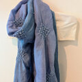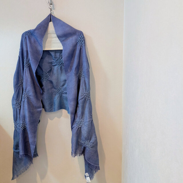 刺しゅうを散りばめた大判ウールストール~ブルーのグラデーションmixカラーと立体刺しゅうが特徴です