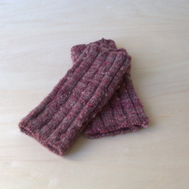 1本1本をつないで糸にしたもので編んだハンドウォーマーです。