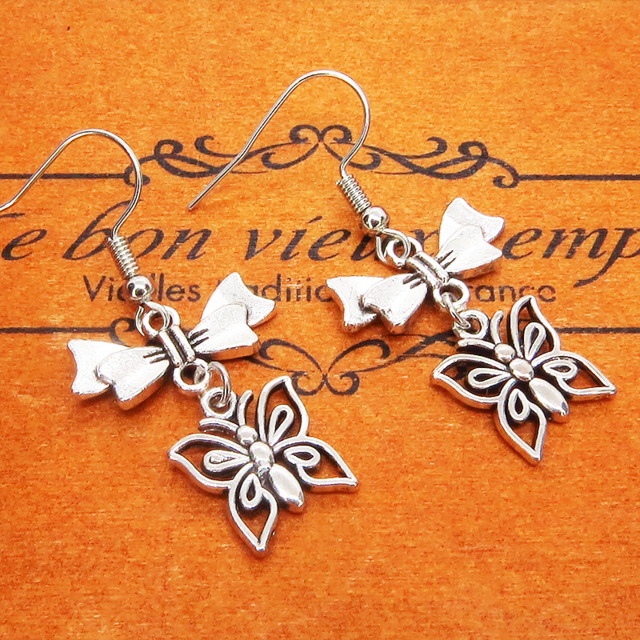アンティークシルバー 蝶とリボンのピアス バタフライ 蝶々 シンプル コンパクト シンメトリー サージカル可