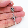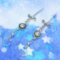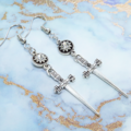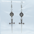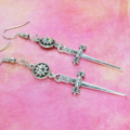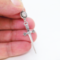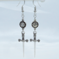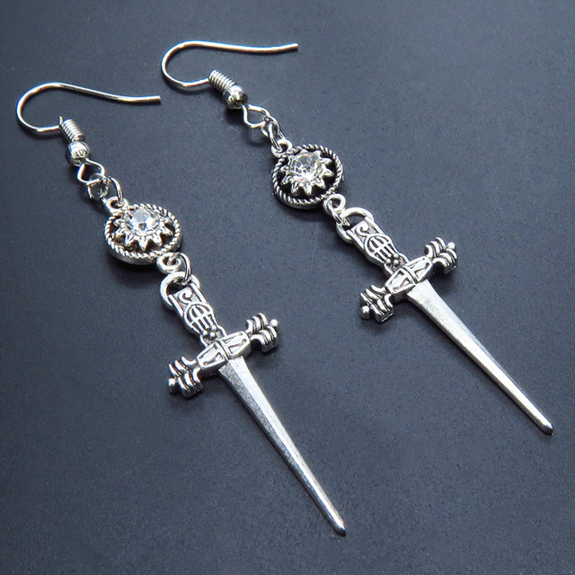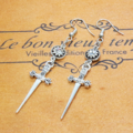 アンティークシルバーで統一した剣とラインストーンを組み合わせたスリムでコンパクトなゴシック調のピアスです