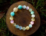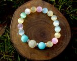 可愛らしいキャンディカラーのレインボーセレナイトと天然のレインボームーンストーン、そして柔らかいブルーが美しいヘミモルファイトの組み合わせです。