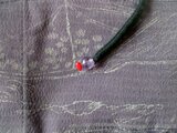 中綿を入れ、正絹の黒のループを付け、ループの先に、アメジストの玉と山サンゴを付けています。