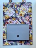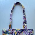 ピンク、イエローなど、さまざまな色の花々が描かれた生地で仕立てたトートバッグです。