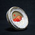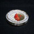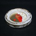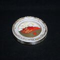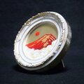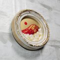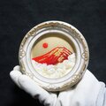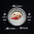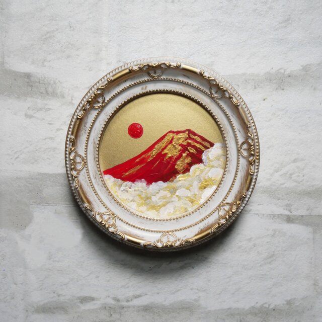 作品の背景には、神聖な黄金色の空が広がり、湧き立つ白い雲は雄大な自然の息吹を感じさせます。手のひらサイズの小さな円形ミニ絵画に、壮大で神秘的な風景が凝縮されていることに驚かされることでしょう。「赤富士」は、お客様の生活空間に希望と開運のエネルギーをもたらす特別な一品です。