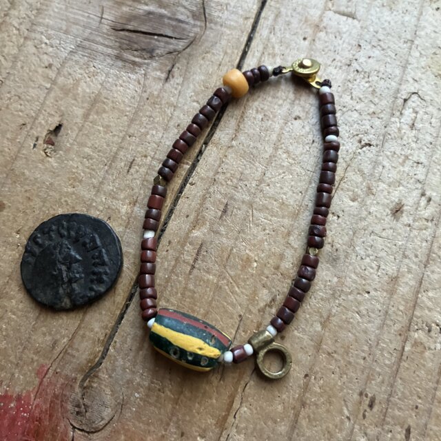 *古のブレス。@ベネチアの古いスジ玉+ビルマの古いビーズ+インドの真鍮チャーム+ジャワのシードビーズなど