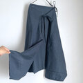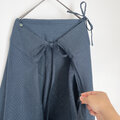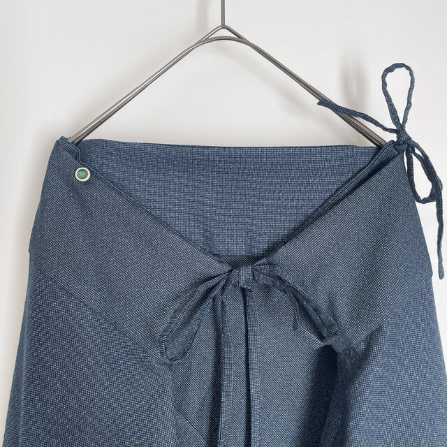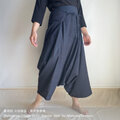 優しい履き心地の三角の形のパンツです。着物地をたっぷりと使ってゆったりとした作りです。ウエストはチベタンスカートと呼ばれる形を参考にしたつくりです。脇の紐を結んでウエストを調節し、余った脇の布を前で結びます。脇の片側はボタンにしましたのでご自分のウエストに合わせてボタンの位置を調整していただくことも可能です。