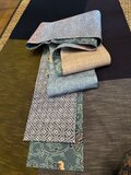 浅葱色地の型染めと紬を合わせ布と
