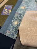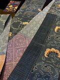型染めのサンプル生地と紬地を縫い合わせてあります。