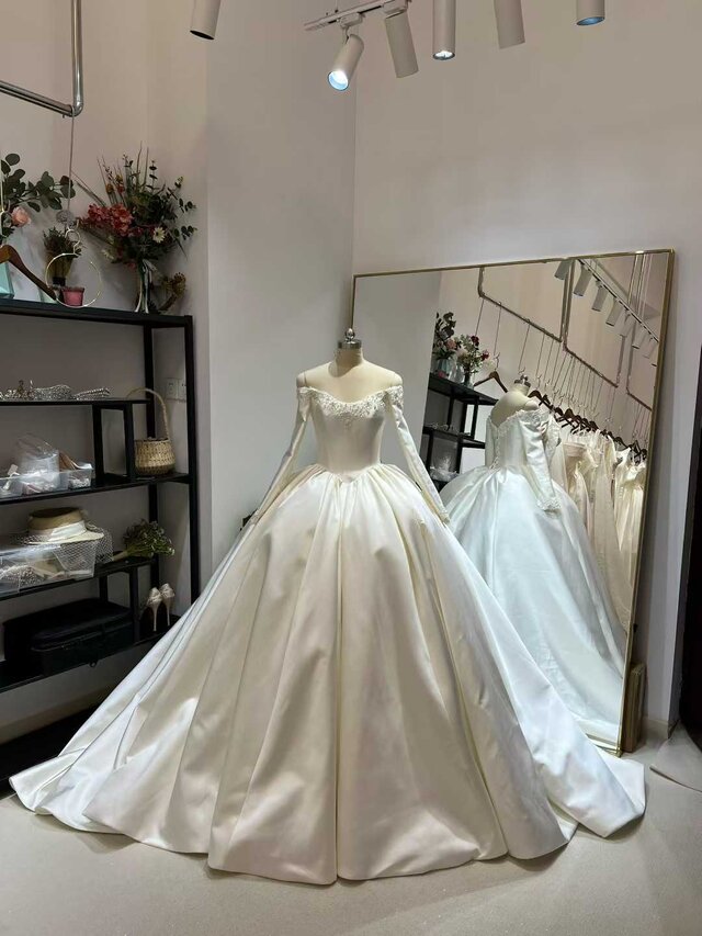 フランス風 ウエディングドレス オフショルダー パール 繊細レース プリンセスライン 拳式/前撮り