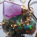 この非加熱ルビーのラフスライスカットにチェーンを下げ、エチオピア産ブラックオパールのタンブルをたわわに下げました