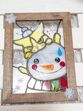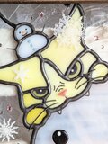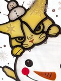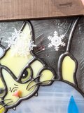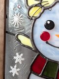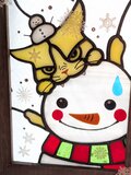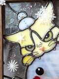 あまりの寒さに雪だるまに噛みついている猫さんをステンドグラスで作りました。