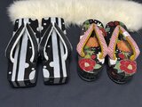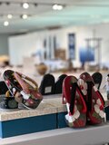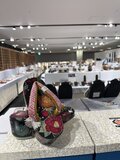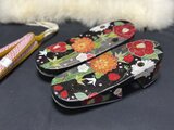 • お花のキラキラした部分には贅沢に細かい貝を蒔きました。左右入れ替えても柄が繋がるようにデザインしています。時々入れ替えて履くと裏の減るペースが整います。