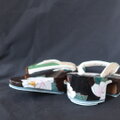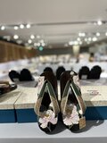 • お花のキラキラした部分には贅沢に細かい貝を蒔きました。左右入れ替えても柄が繋がるようにデザインしています。時々入れ替えて履くと裏の減るペースが整います。
