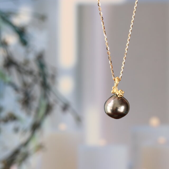 形も色も優しいパールと、K18の艶を抑えた植物モチーフのバチカンが優しい、ほっこりするペンダントトップです