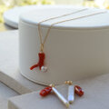 国産の赤珊瑚とアコヤ真珠——ふたつの海の恵みをひとつにしたネックレスです。