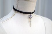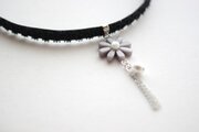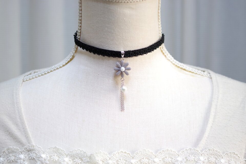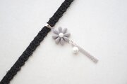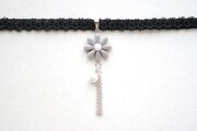 濃いグレーのお花を、ベルベットリボンにタティングレースで装飾を施したチョーカーに仕上げました。