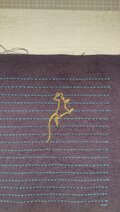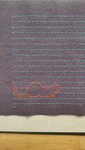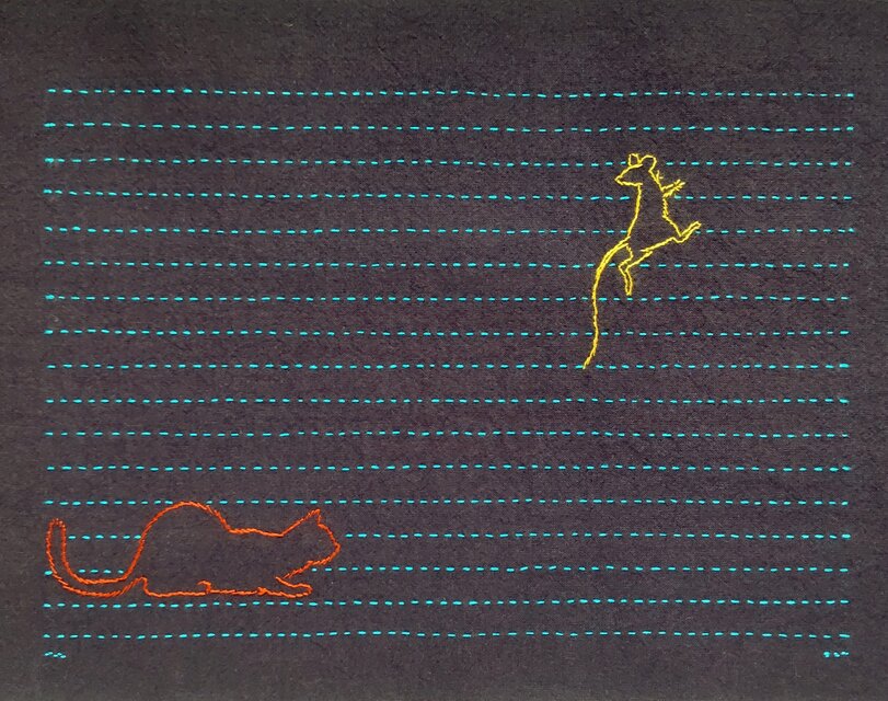 裏地は黒に近い紫色で、猫はオレンジ、ねずみは黄色で刺繍をしています。 全体に ビビットなブルーの糸で、刺し子をしました。