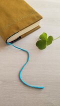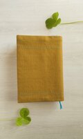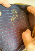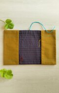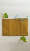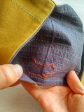 表地は、しっかりした帆布の辛子色の布です。ビビットなブルーでの刺し子が映えます。
