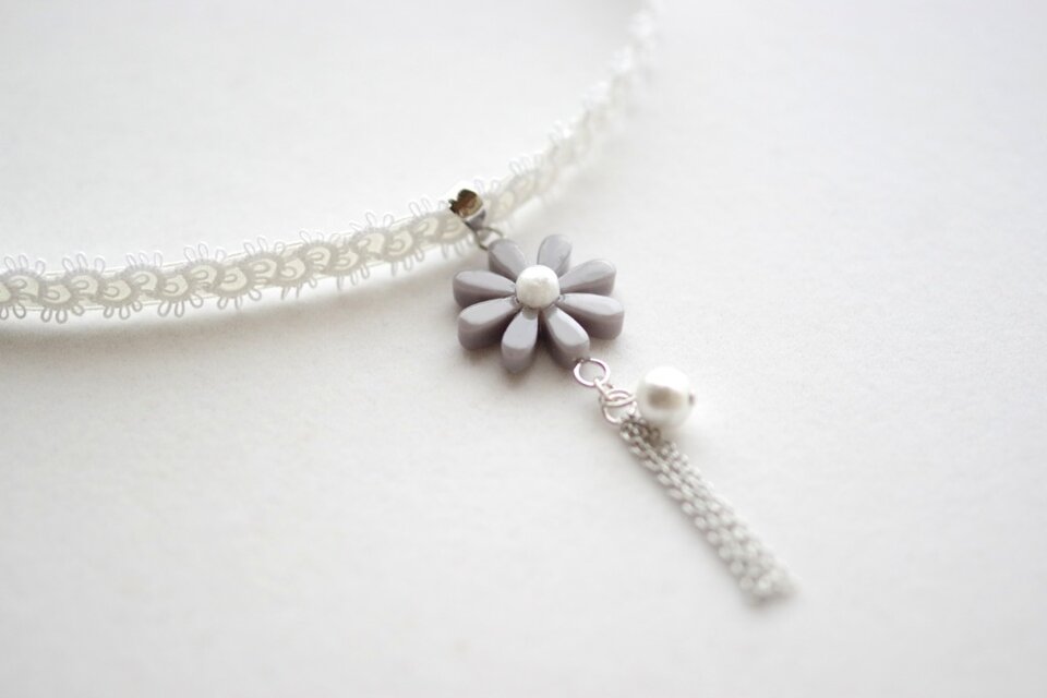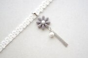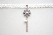 濃いグレーのお花を、サテンリボンにタティングレースで装飾を施したチョーカーに仕上げました。