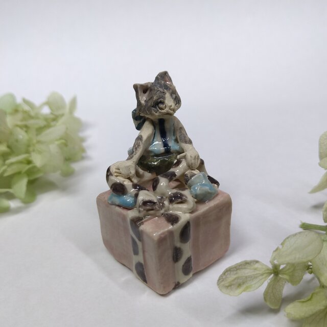 小さなプレゼントの上にハチワレねこがちょこんと座ってリボンを結んでいます。