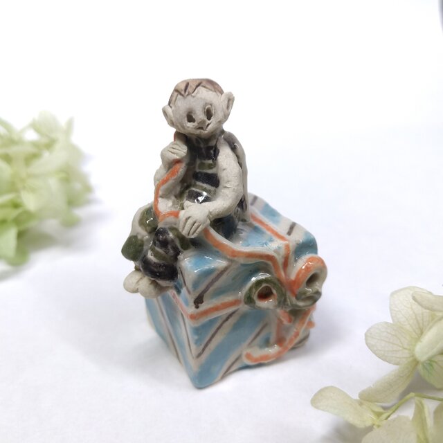プレゼントや羽根、衣装の一部分に薄く透明釉を施しているので、その部分は少し光沢があります。