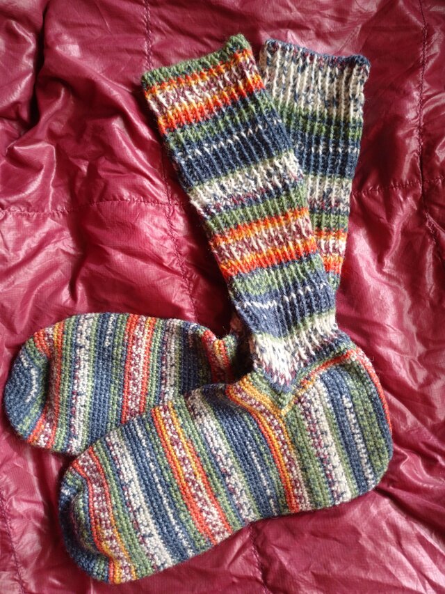 足の部分は フィットするように細編みで、脛の部分は一目ゴム編みで編んでいます。