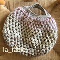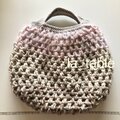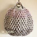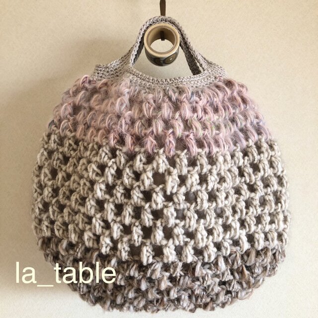 さまざまな色合いの糸をぐるぐると編み進めてバッグに仕立てました。