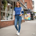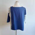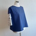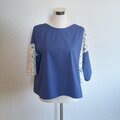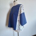 美しいロイヤルブルーの無地と、繊細なボタニカル柄のテキスタイルを大胆に切り替えた、表情豊かなプルオーバーです。