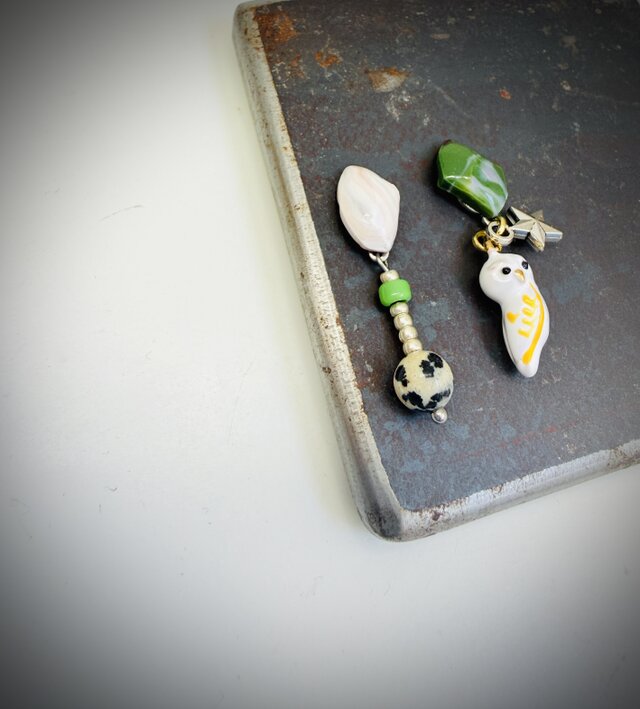 鉱石のようなカタチのオリジナルプラスチックに、海外のフクロウパーツと天然石ダルメシアンジャスパーを組み合わせました。