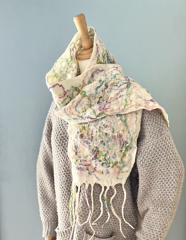 メリノウールフェルトのカラフルなロングマフラー(ホワイト)