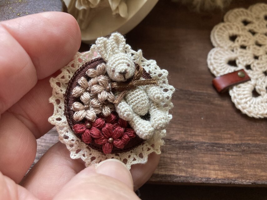 刺繍糸1本取りで編む、マイクロクロッシェ・うさぎとお花のミニブローチ(4.5cm)