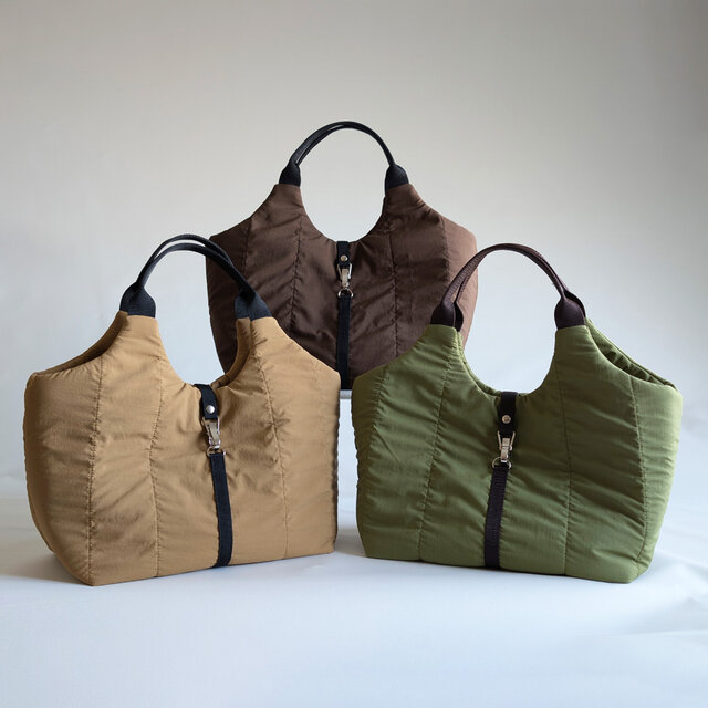 少し長めの手提げなので厚めのアウターでも肘掛けがしやすい長さにしています。