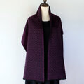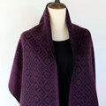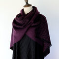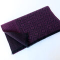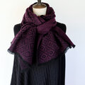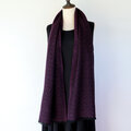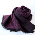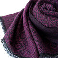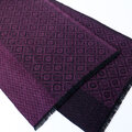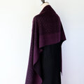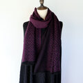 ブラックの糸をベース織りに、深みのある赤紫の糸で柄を織り出しています。布幅の三分の一ほどは織柄を変えて色の出方にも変化をつけているので、表と裏で表情の違いをお楽しみいただけます。広げて肩から羽織るだけでなく、首元に巻いてマフラーのようにもお使いいただけます。フリンジは縁かがり止めしてるので、糸がほつれてくることはありません。落ち着いたトーンのシックでエレガントな雰囲気のストールで、秋冬コーデのポイントとしてお使いいただけると思います。